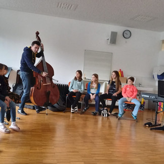 In einem Workshop mit zwei Musikern (Kontrabass und Fagott) des Bruckner-Orchester Linz, wurden die Schüler*innen und Schüler der 1m und der 2b auf die Fahrt ins Musiktheater vorbereitet. Stücke aus dem Programm des "Move On"-Konzerts, das am 13. Dezember besucht wird, wurden gemeinsam und interaktiv mit dem Kontrabassisten Josef und dem Fagottisten Hannes erarbeitet.